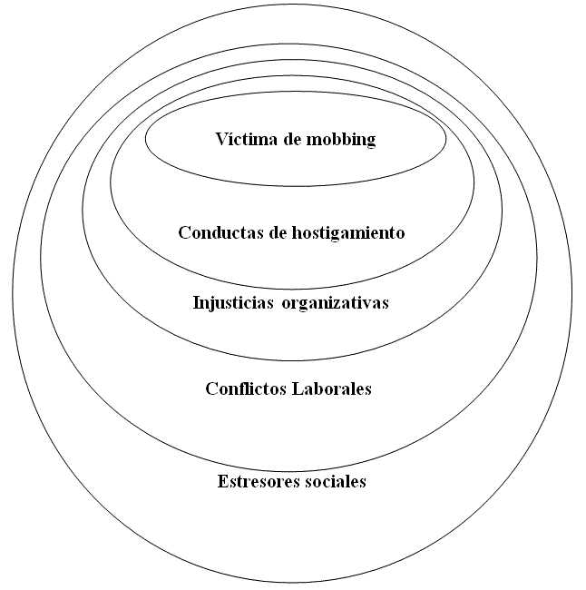 Zapf (2004) propone un modelo para ilustrar y facilitar la comprensión del mobbing, y sus distintas manifestaciones. Este modelo lo representa en forma de cinco círculos concéntricos.